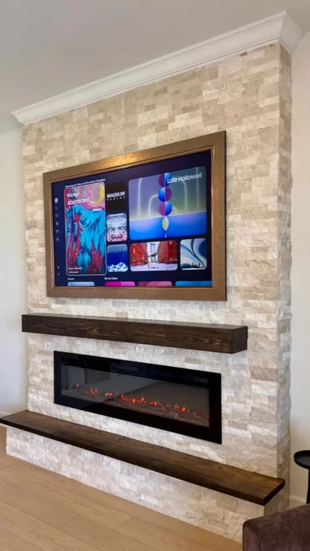 A textured fireplace media wall finished with ledger stone and warm wood accents. Designed to feel solid, architectural, and timeless.