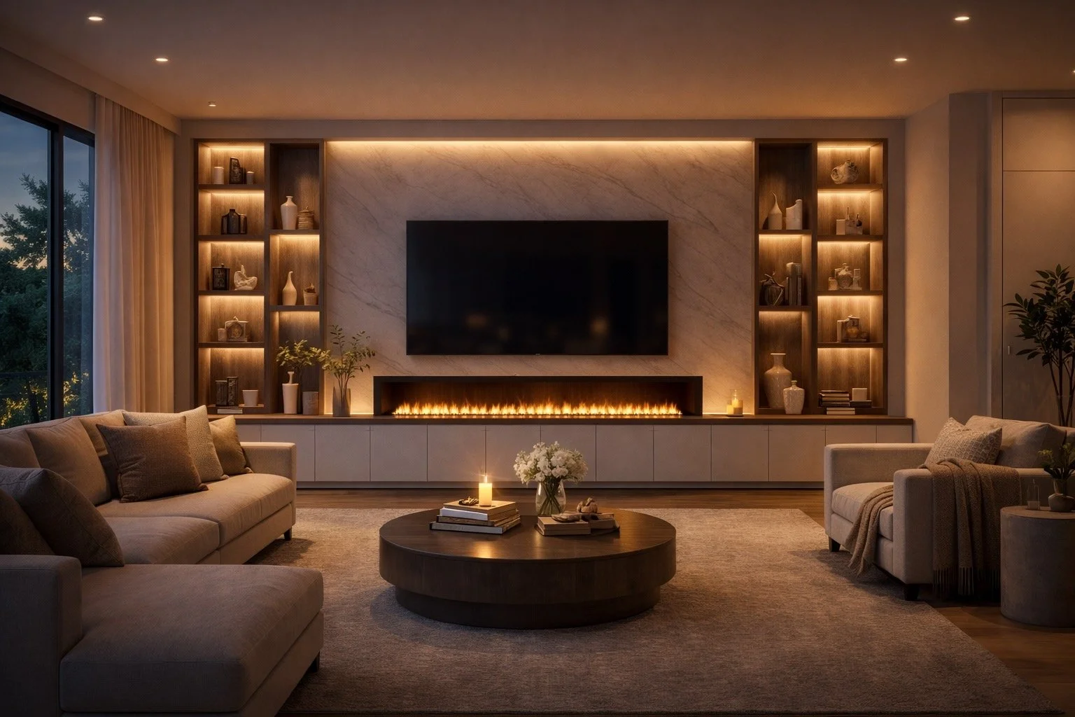 A premium fireplace media wall finished with natural stone and a wood mantel. Designed as a strong, timeless centerpiece for luxury interiors.