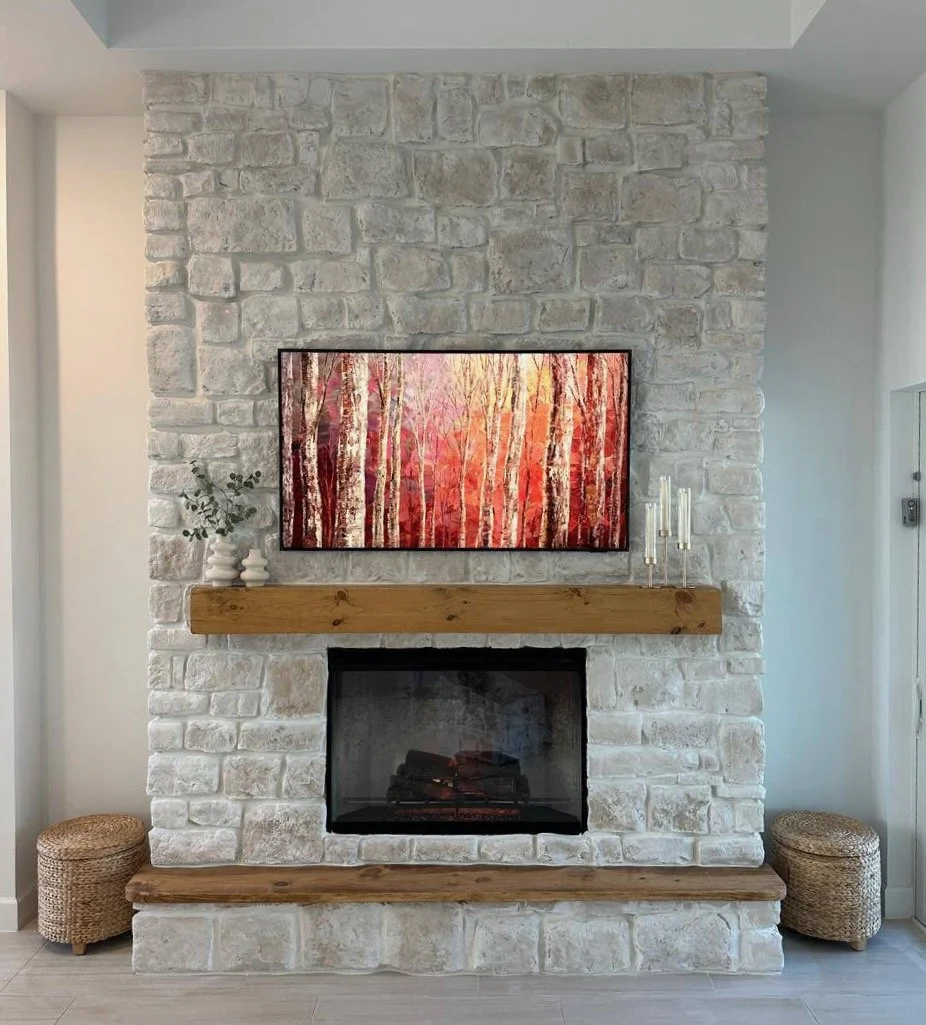 A textured fireplace media wall finished with ledger stone and warm wood accents. Designed to feel solid, architectural, and timeless.