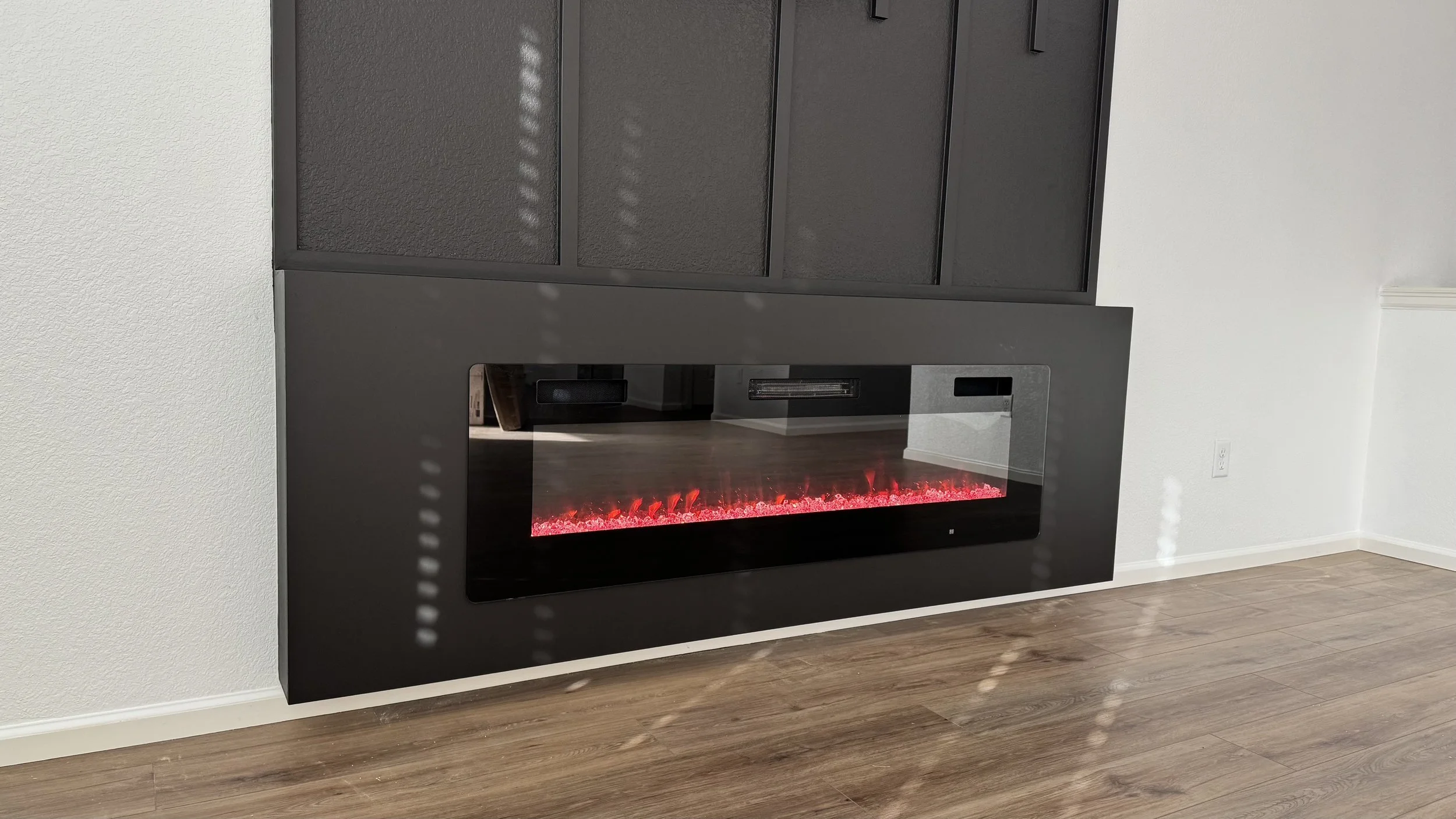 Incluye una pared de acento negra con chimenea eléctrica integrada.