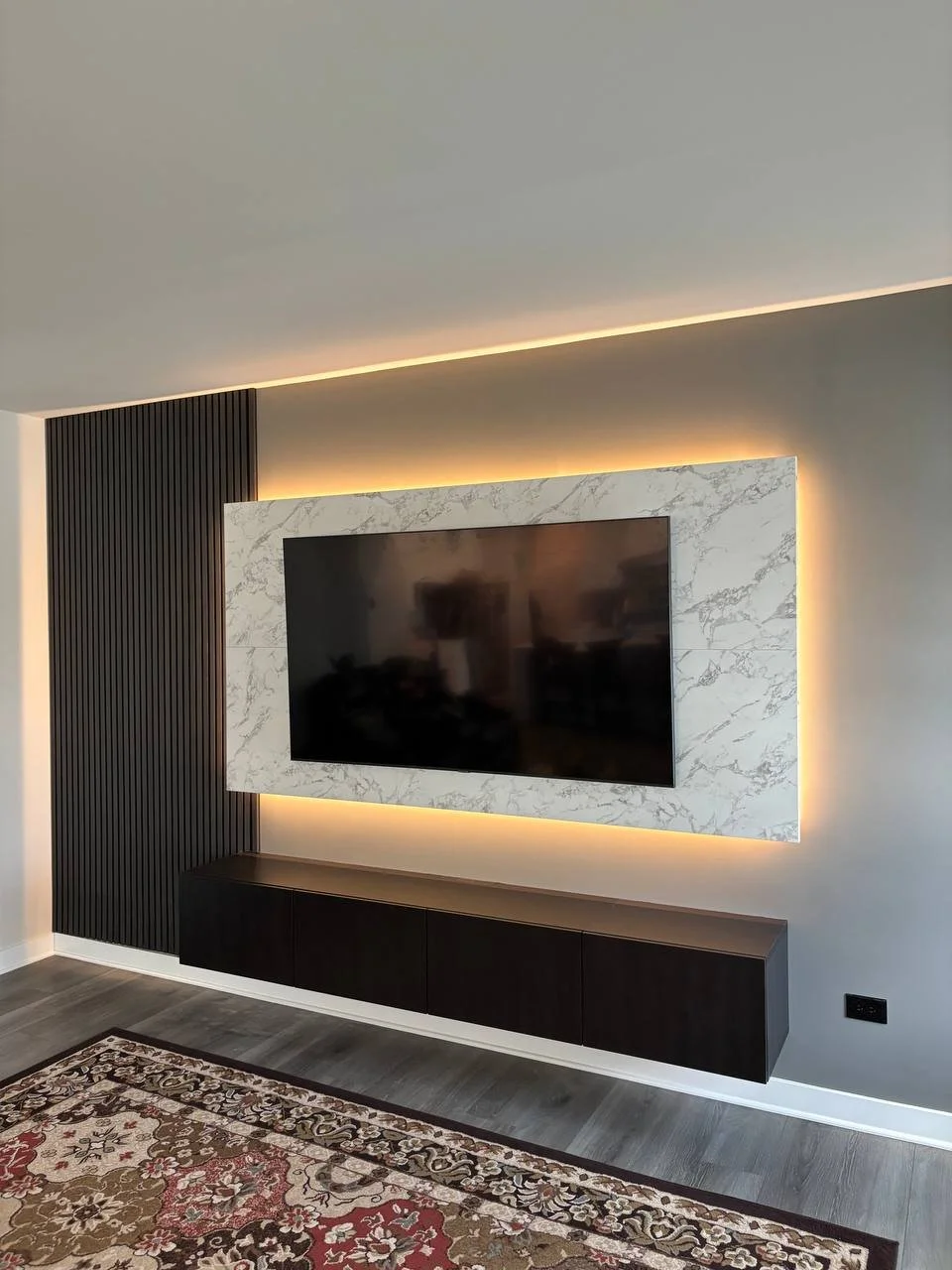 A marble-look back panel with integrated ambient LED lighting serves as the visual centerpiece, creating a glowing frame behind the mounted TV. Below, a floating black cabinet provides storage and balance to the composition, while the left side of the wall is adorned with vertical wood slat panels for a rich, textural contrast. The result is a clean and elegant media solution that adds architectural value to any living space without the need for a fireplace.
