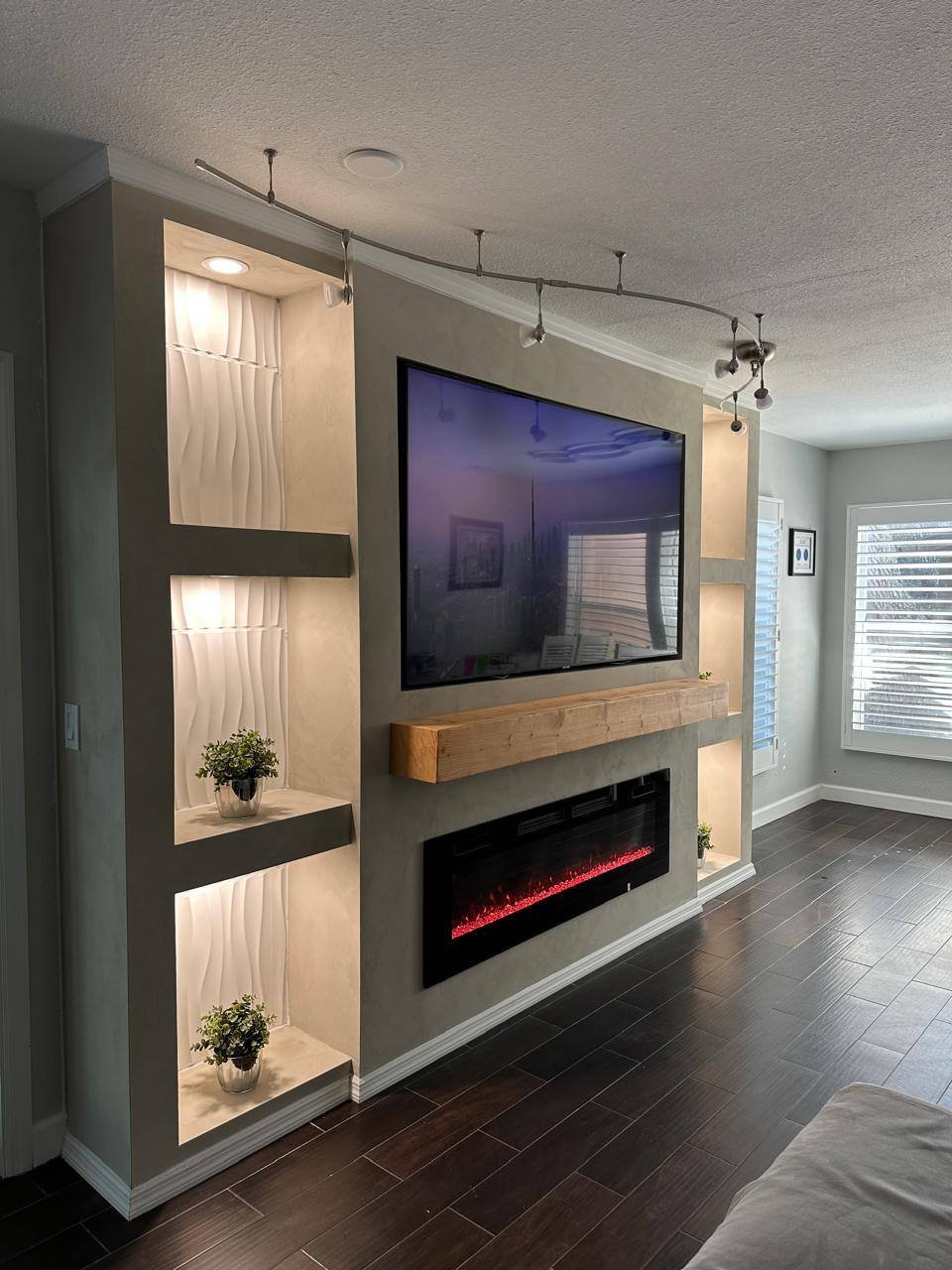 Creamos esta pared de medios personalizada en Melbourne, Florida, con una chimenea eléctrica, repisas con luces, estanterías decorativas y un acabado de yeso limewash ecológico. Este diseño combina elegancia moderna con calidez natural.
