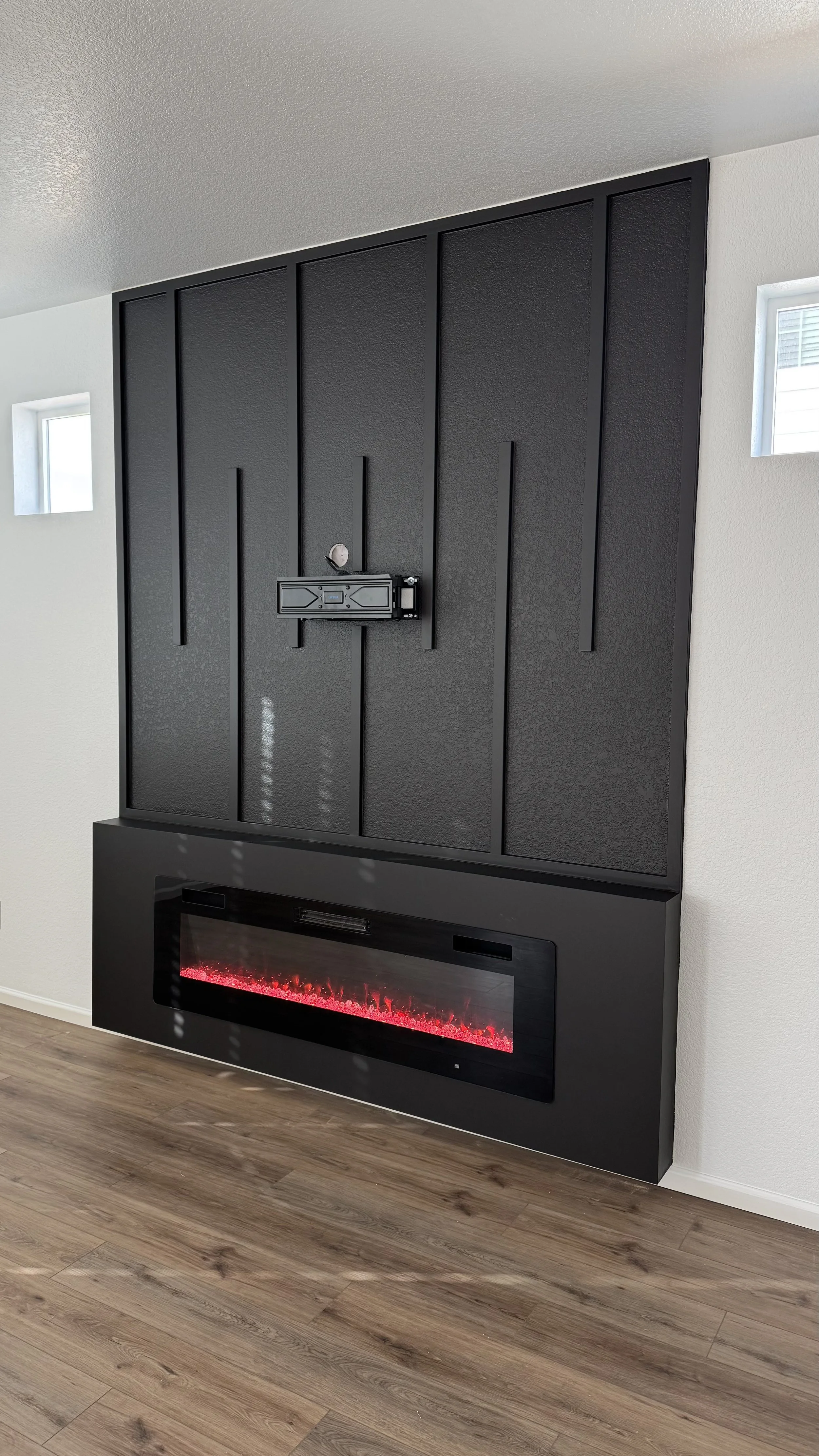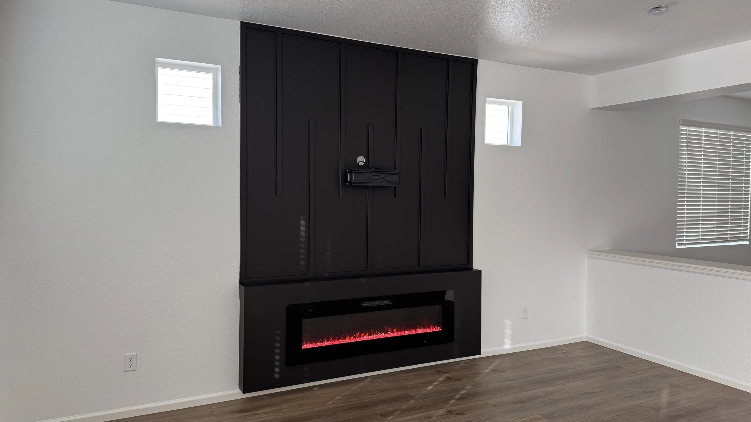 The lower section features a built-in electric fireplace with a glowing ember bed, adding warmth and ambiance without compromising floor space. The wall is also equipped with a TV mount for a streamlined media experience. Clean lines, symmetry, and color contrast make this project a perfect representation of modern interior accent design.