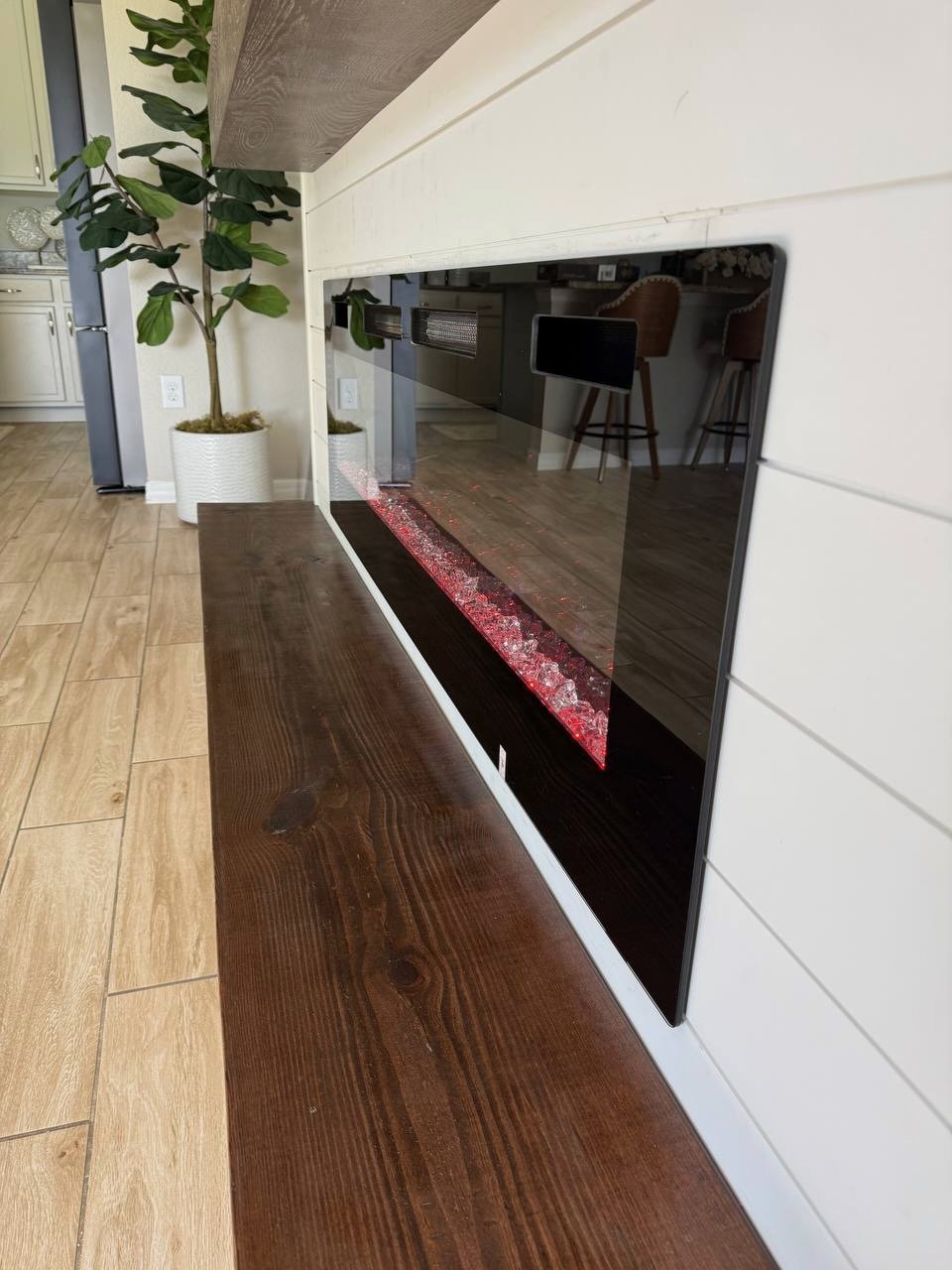 The electric fireplace provides visual warmth without heat overload, which suits the Florida climate. All wiring, mounting, and finishing details were integrated into the wall for a clean, built-in appearance.