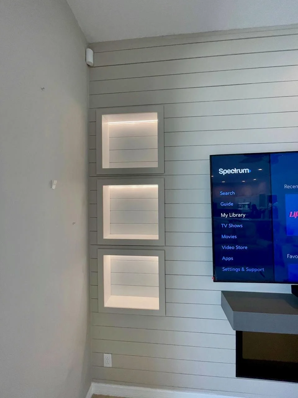 Three recessed niches were built into the left side of the wall to create a decorative lighting feature. Each niche includes integrated LED strip lighting and hidden electrical outlets for decorative objects or small devices. These illuminated recesses introduce depth and soft ambient lighting that enhances the entire entertainment wall.