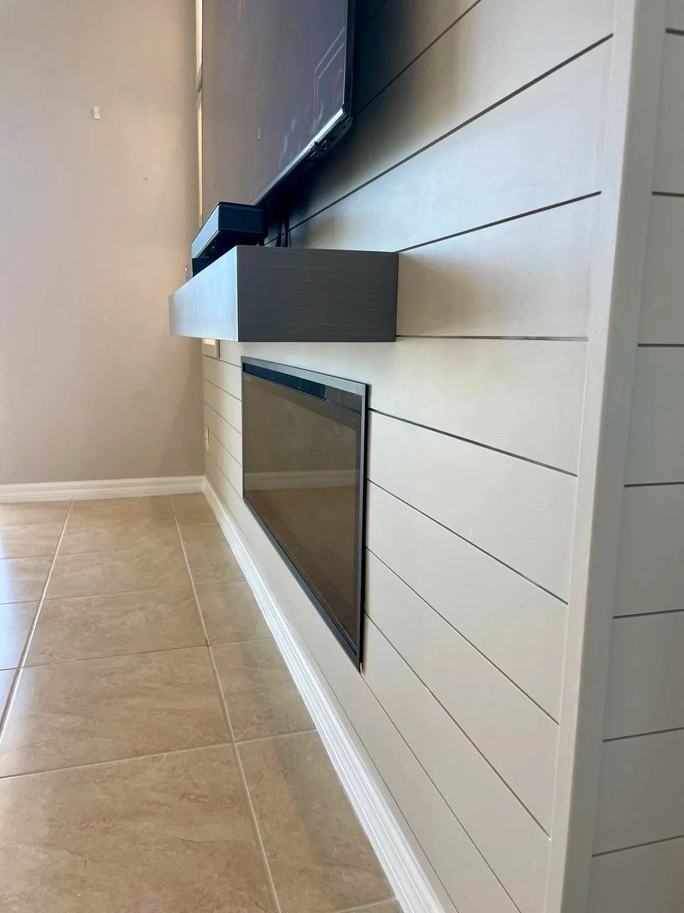 The wall was finished with horizontal shiplap panels, creating a calm texture that complements the neutral interior palette of the home. A floating wood mantel with veneer finish visually anchors the TV and fireplace while adding warmth to the composition.