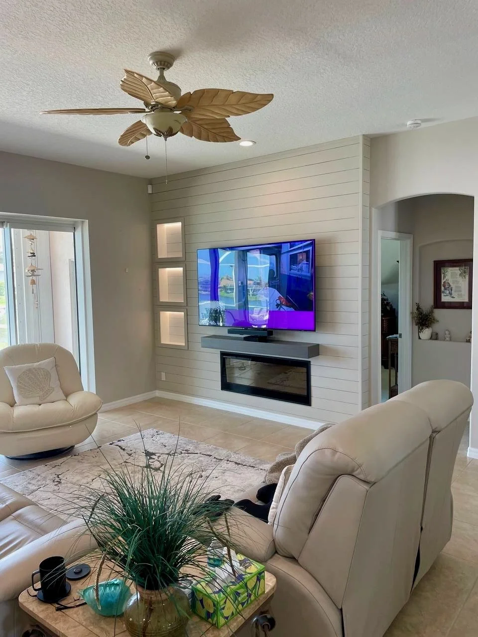 Este proyecto presenta una moderna pared multimedia con chimenea eléctrica instalada en Bradenton, Florida. La estructura se diseñó con paneles horizontales tipo shiplap para crear una textura arquitectónica limpia que se integra con el interior de la sala.
