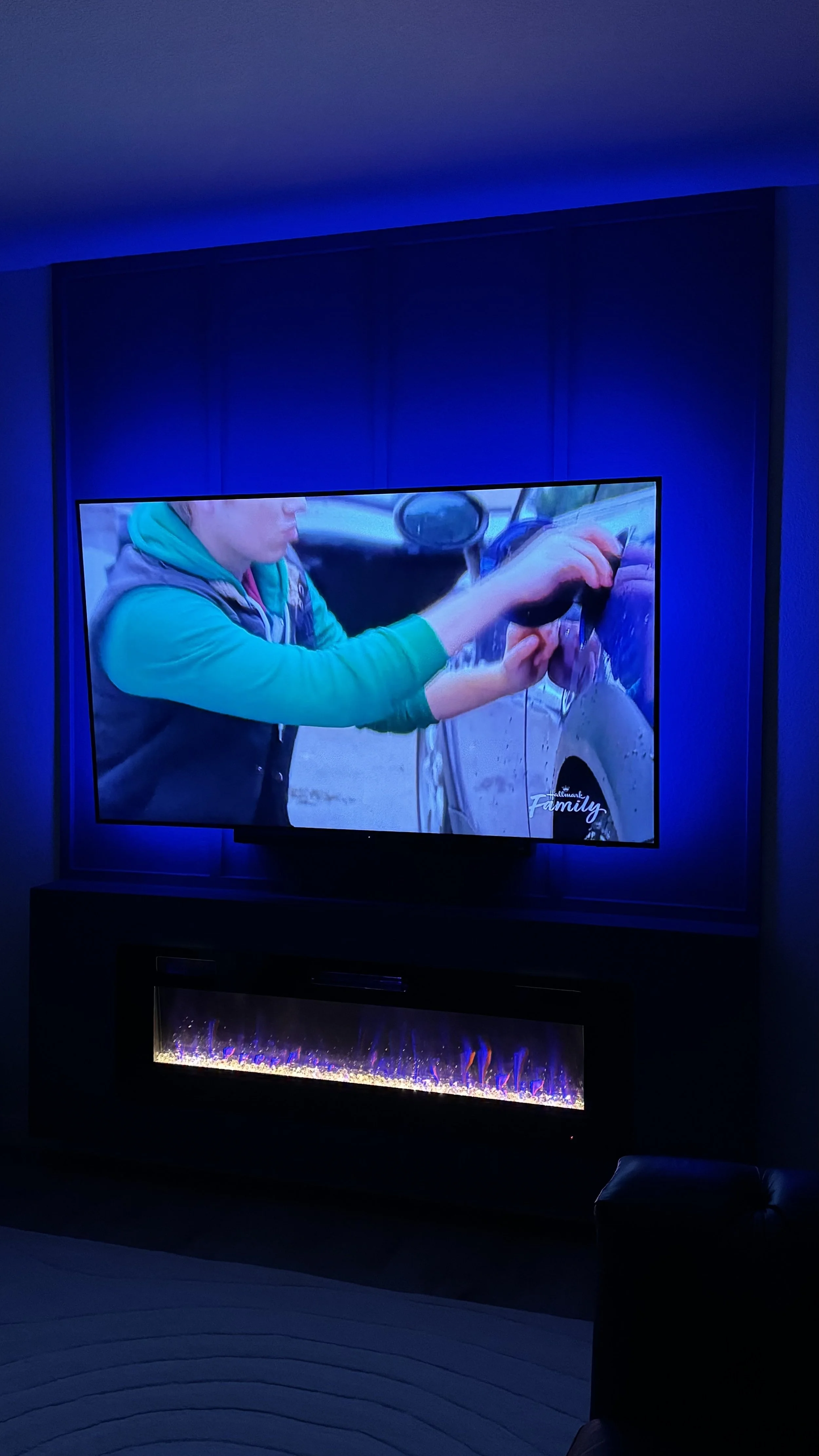 Night view of the media wall fully illuminated, with blue LED lighting behind the TV and a glowing electric fireplace, creating a cozy modern atmosphere.