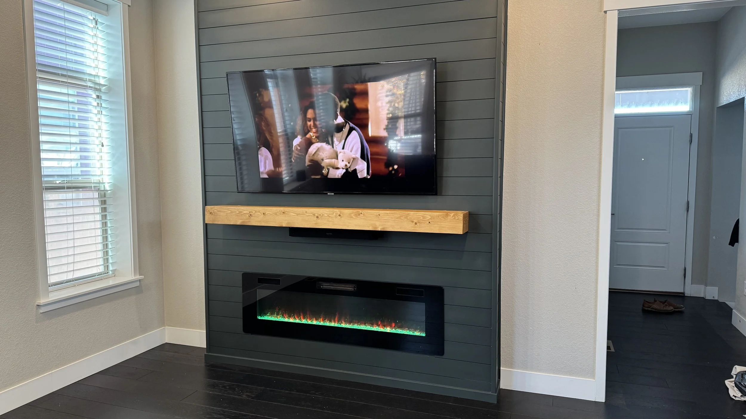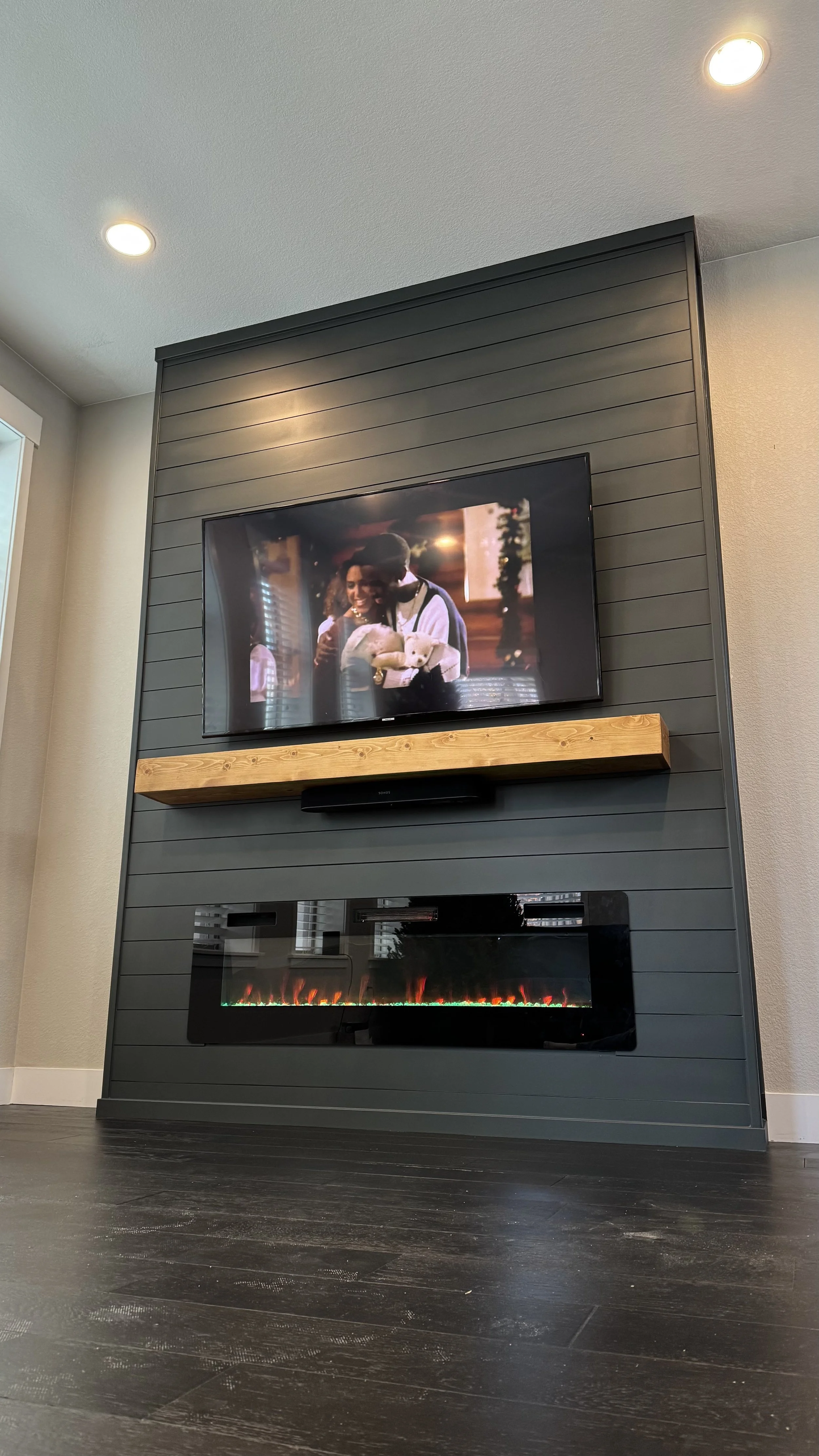 This modern TV media wall was designed and installed in Union Park, Florida (Orange County). The project features a sleek shiplap wall paneling design, painted in a deep gray tone that creates a strong visual contrast with the natural wood mantel. The electric fireplace insert adds warmth and ambiance, with dynamic color-changing flames that enhance the room’s modern feel. Above the mantel, a flat-screen TV is mounted flush to the wall, completing a clean and organized entertainment setup.