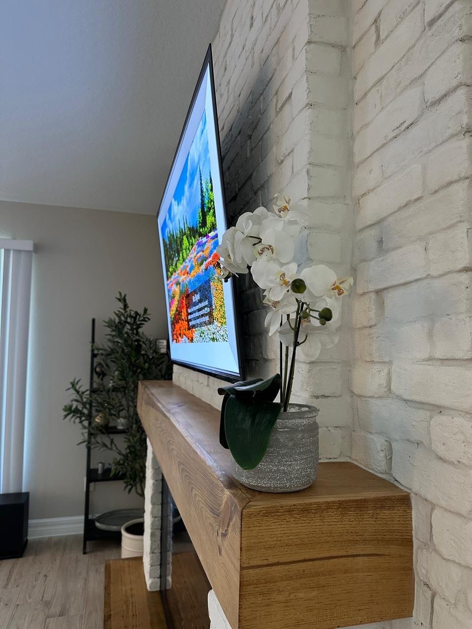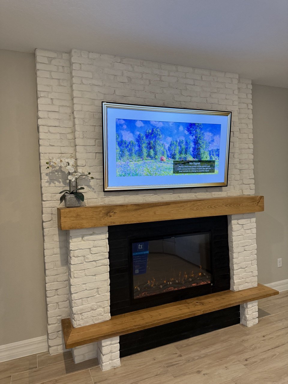 This custom white brick fireplace media wall was designed and installed in Winter Garden, Florida. The project combines painted white brick with a contrasting black inset section for the electric fireplace, creating depth and visual balance. The design features natural oak-stained wooden shelves and a mantel, adding warmth and texture against the crisp brick finish. The wall-mounted TV above the fireplace completes the composition, forming a classic yet contemporary centerpiece for the living room.